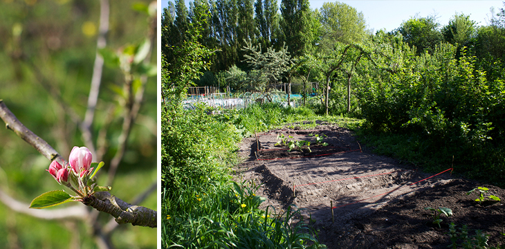 Met een jaartje ervaring op het Zuiderpark, het transfomeren van onze eigen kleine stadstuin tot eetbare wildernis en een pakketje Taco-kennis in mijn achterzak, begon het grote avontuur. Tijdens onze kennismaking had Eelke me een korte rondleiding door te tuin gegeven en kreeg ik het verweerde logboek in handen. Ik maakte al snel kennis met een aantal volkstuinders en de mensen van Pluk!, die met hun tuinen aan de permacultuurtuin grenzen. Het weer werd zachter en langzaam kon ik met eigen ogen zien wat er allemaal opkwam.