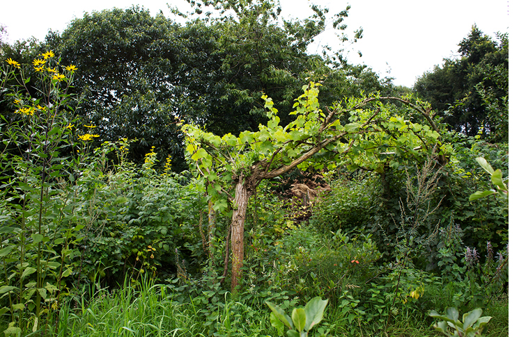 Twee jaartjes verwaarlozing leek voor de bessenstruiken een zege te zijn geweest, maar de kruidenspiraal had zich ontpopt tot een monsterlijke berg vol gras, munt en brandnetel, waar ik met moeite nog 1 pimpernel en 1 bloedzuring uit wist te vissen. De centrale appelboom was flink gegroeid waardoor de wilgen aan de rand van de eerste cirkel rondom de boom inmiddels op de druplijn van de appelboom stonden, precies daar waar de wortels van de boom het meest actief zijn.