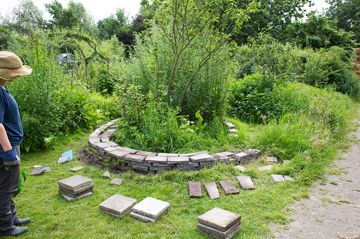 De rij met appelboompjes aan de rand, van oorsprong een kleine soort, was boven de ent gaan wortelen en volledig uit z’n voegen gegroeid. Het was begin maart, ik moest snel handelen. Ik maakte een radicale keuze: drie boompjes verplaatsen uit de rij, de kruidenspiraal afgraven, 1 van de uit de klauwen gegroeide appelbomen herplanten op de vrijgekomen plek, hieromheen een gilde planten en een zitbank bouwen met de resterende tegels uit de kruidenspiraal.